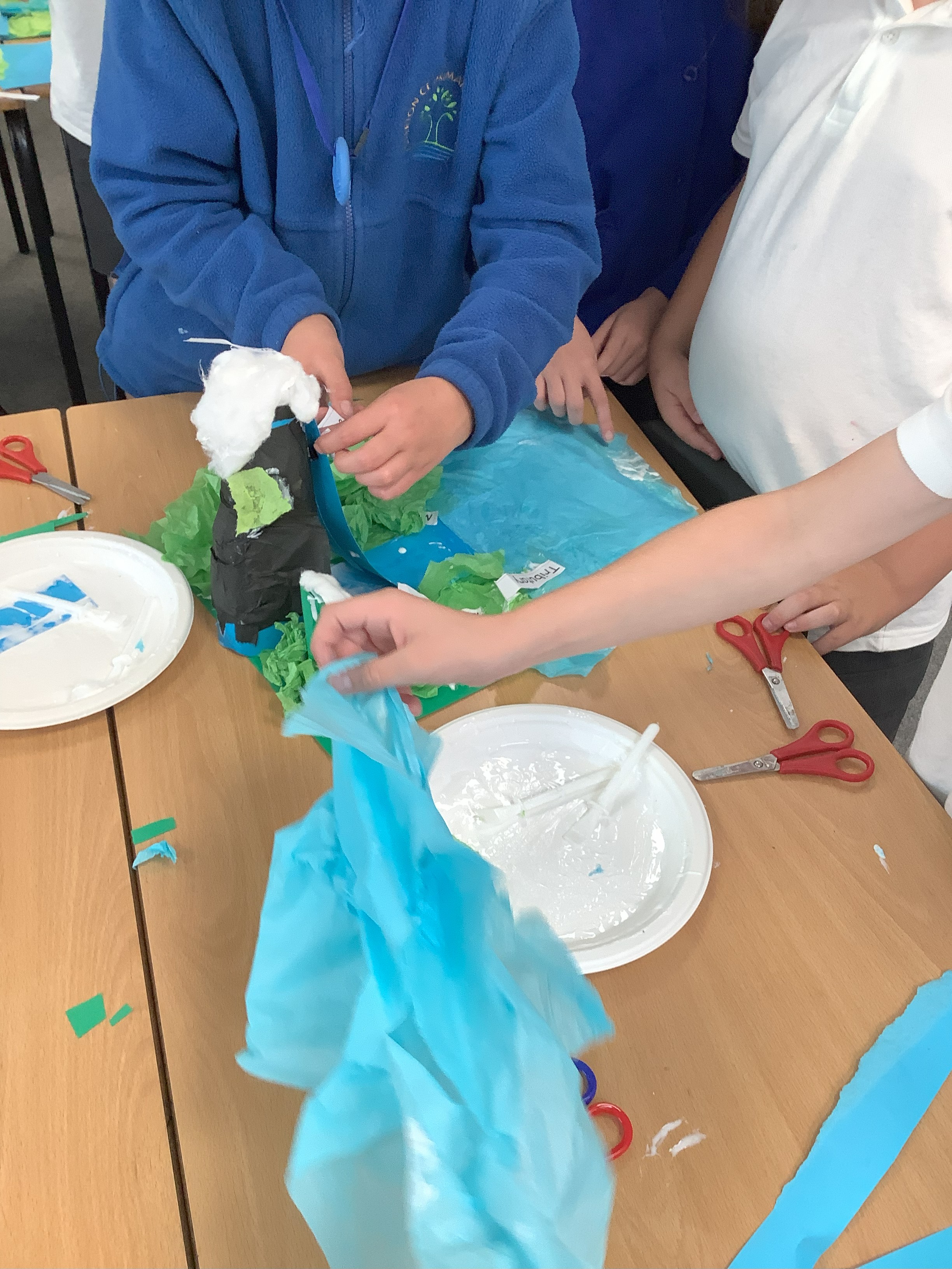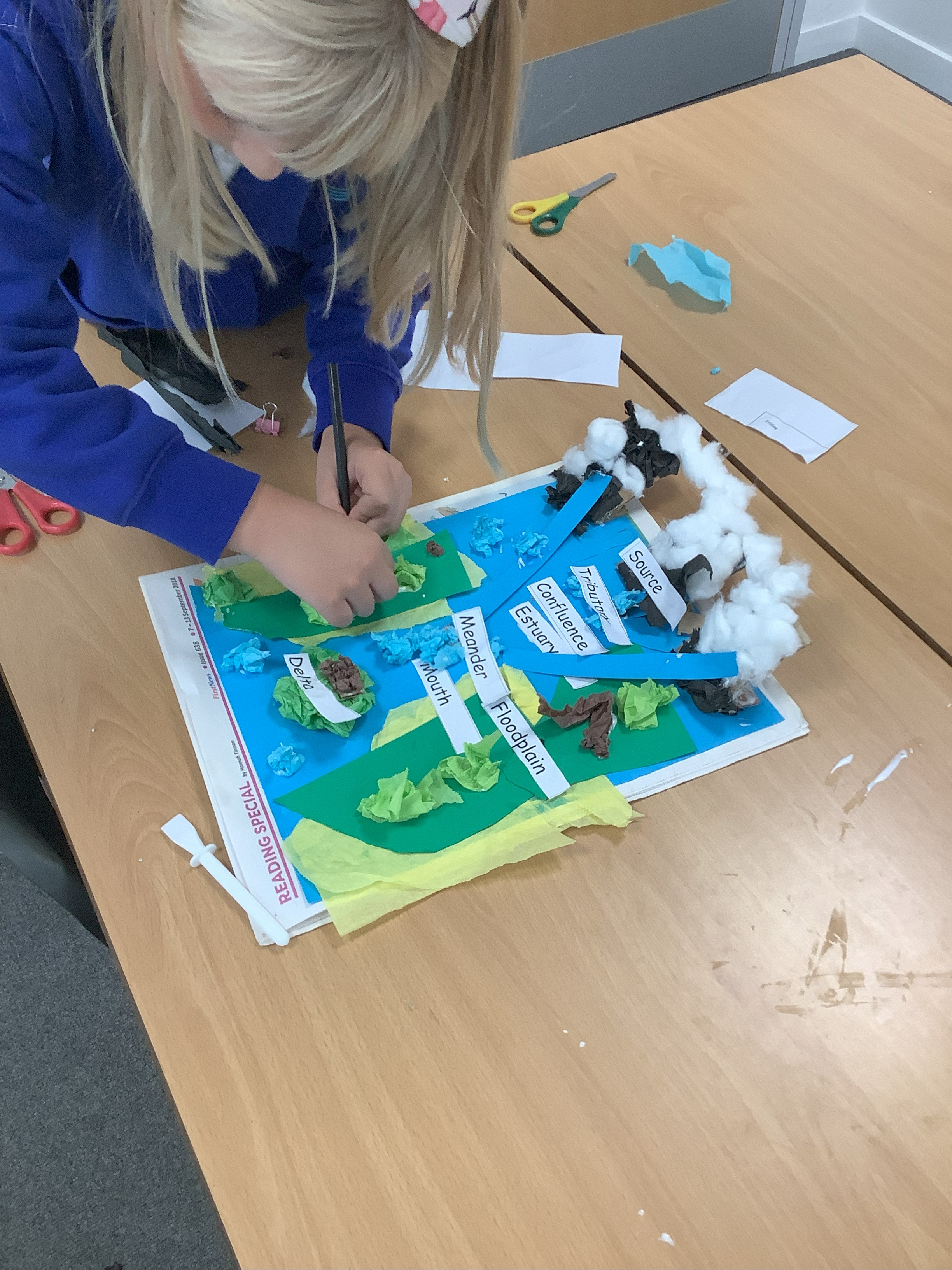 To begin our River topic, we had great fun working collaboratively and creatively to generate mixed media 3 D plans of the course of a river, showing our understanding before we begin to learn about how rivers really work! We had a go at labelling our models with some of our key words for this half term.