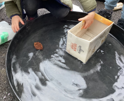 For transport week, we made our own boats out of recycling given to us and tried to make our boats float. We experimented with which materials float in the water and talked about whether our boat would hold a person in it without sinking.
