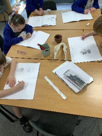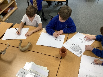 In one lesson, we had a range of pre-historic artefacts on our tables to make sketches of and to piece together the clues to predict what they might be used for and who might have used them.