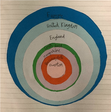 Our Geography lessons this half term have been all about our local study of Overton. First, we found Overton on Google Maps and zoomed out to discover the nearest town, then what county, country, and continent we live in. To help us visualise and understand this we created our own circle maps. To help us to further our geography knowledge, we were asked to draw a map of our route to school. This needed to include physical and human features that we pass on our way to school such as a church, river, traffic lights, fields and shops.