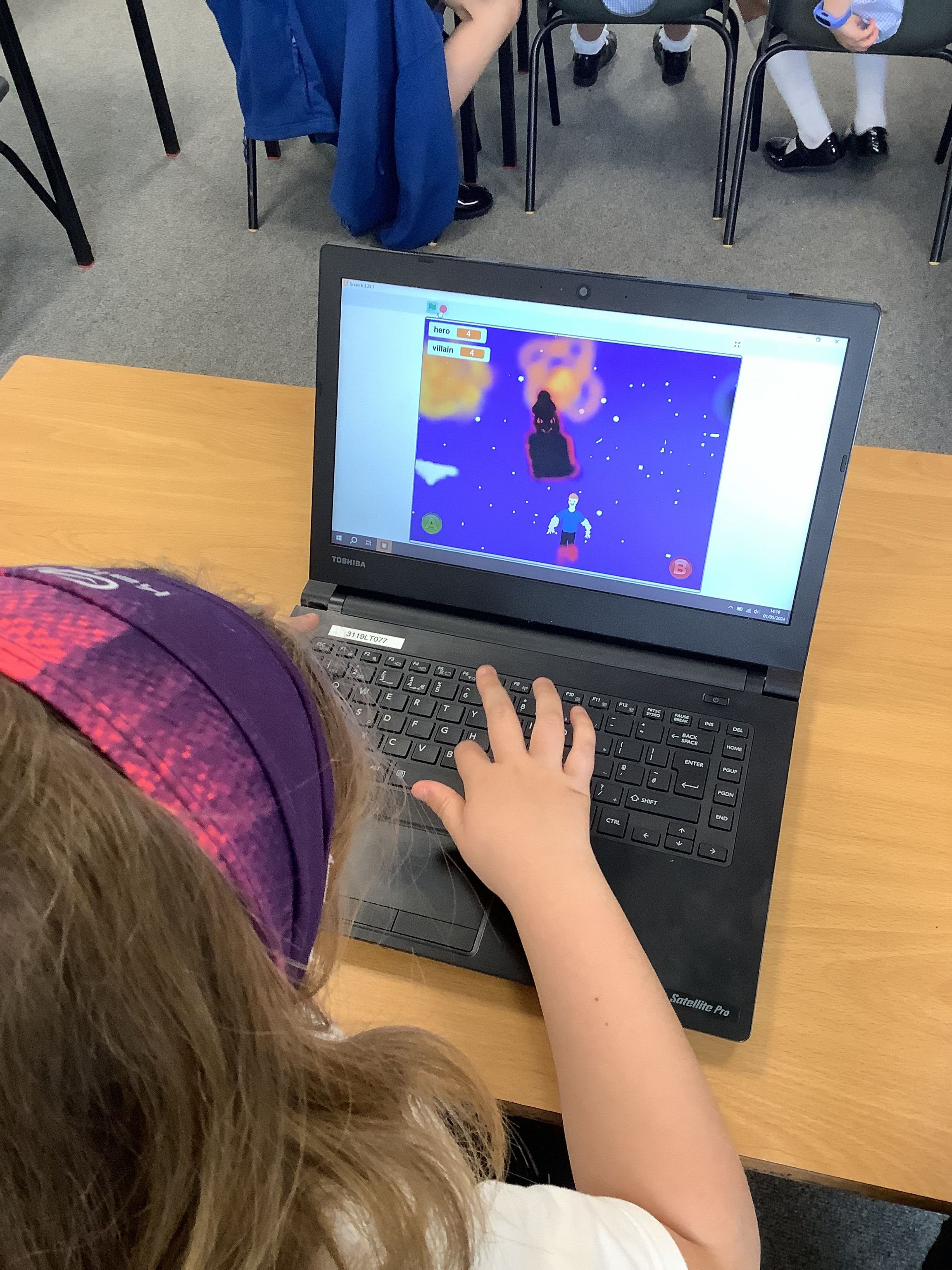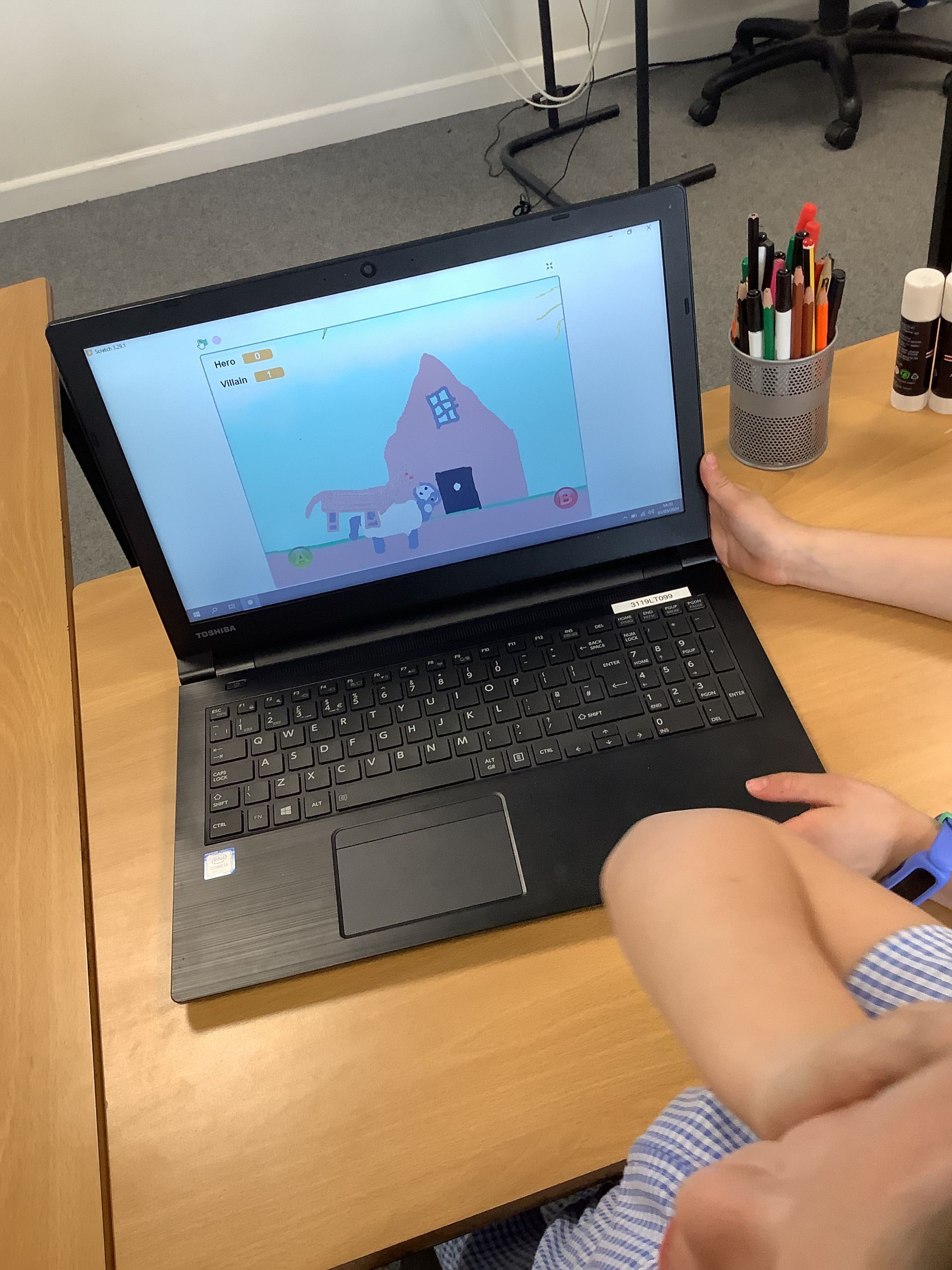 Our hero would should a lightning bolt every second and we coded it so that if the lightning bolt touched the villain they lost one of their 5 points. If the villain bumped into the hero, then the hero lost one of their five points.