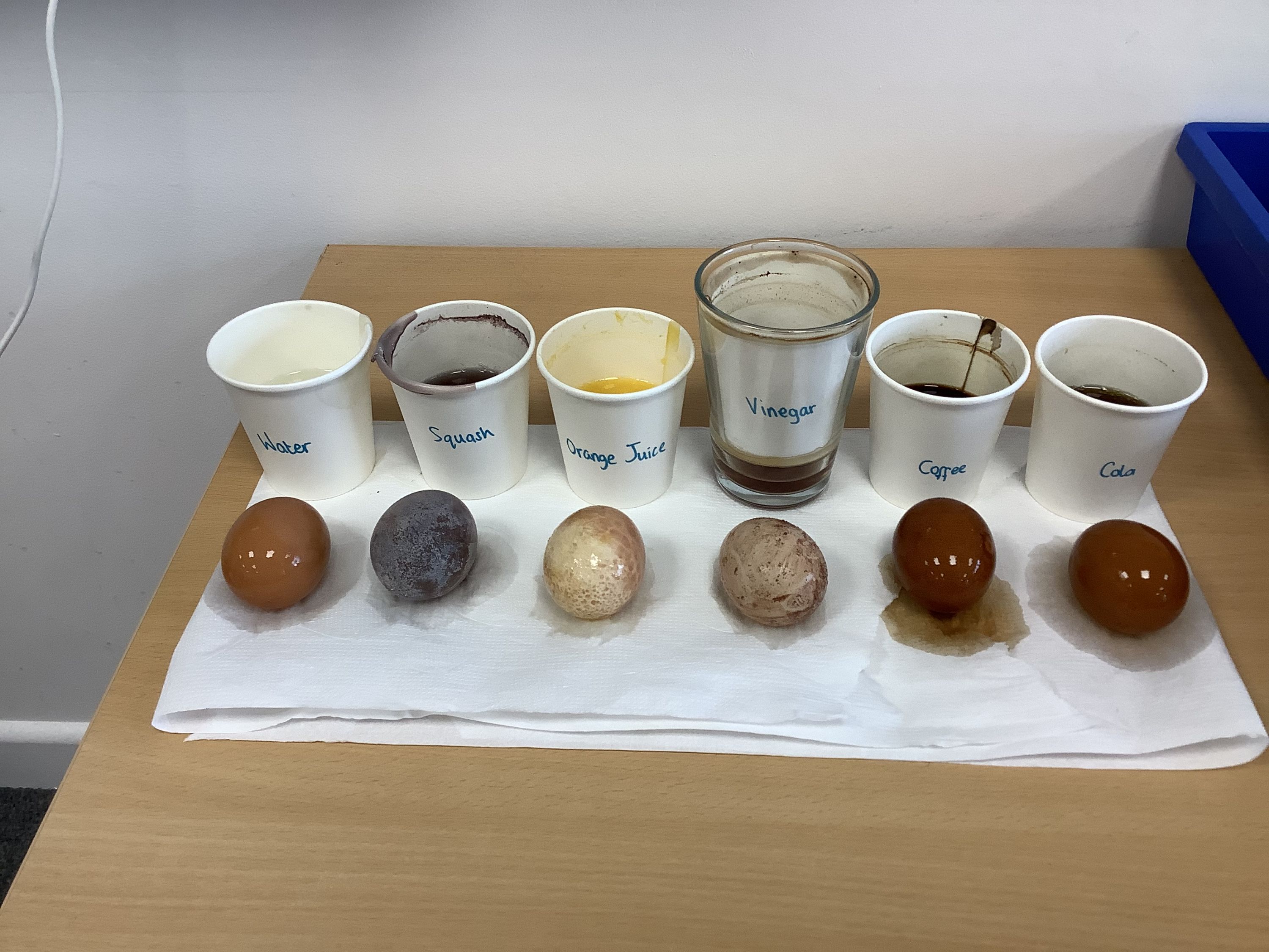 We placed the eggs in 250ml of water, orange squash, orange juice, vinegar, coffee and coke.