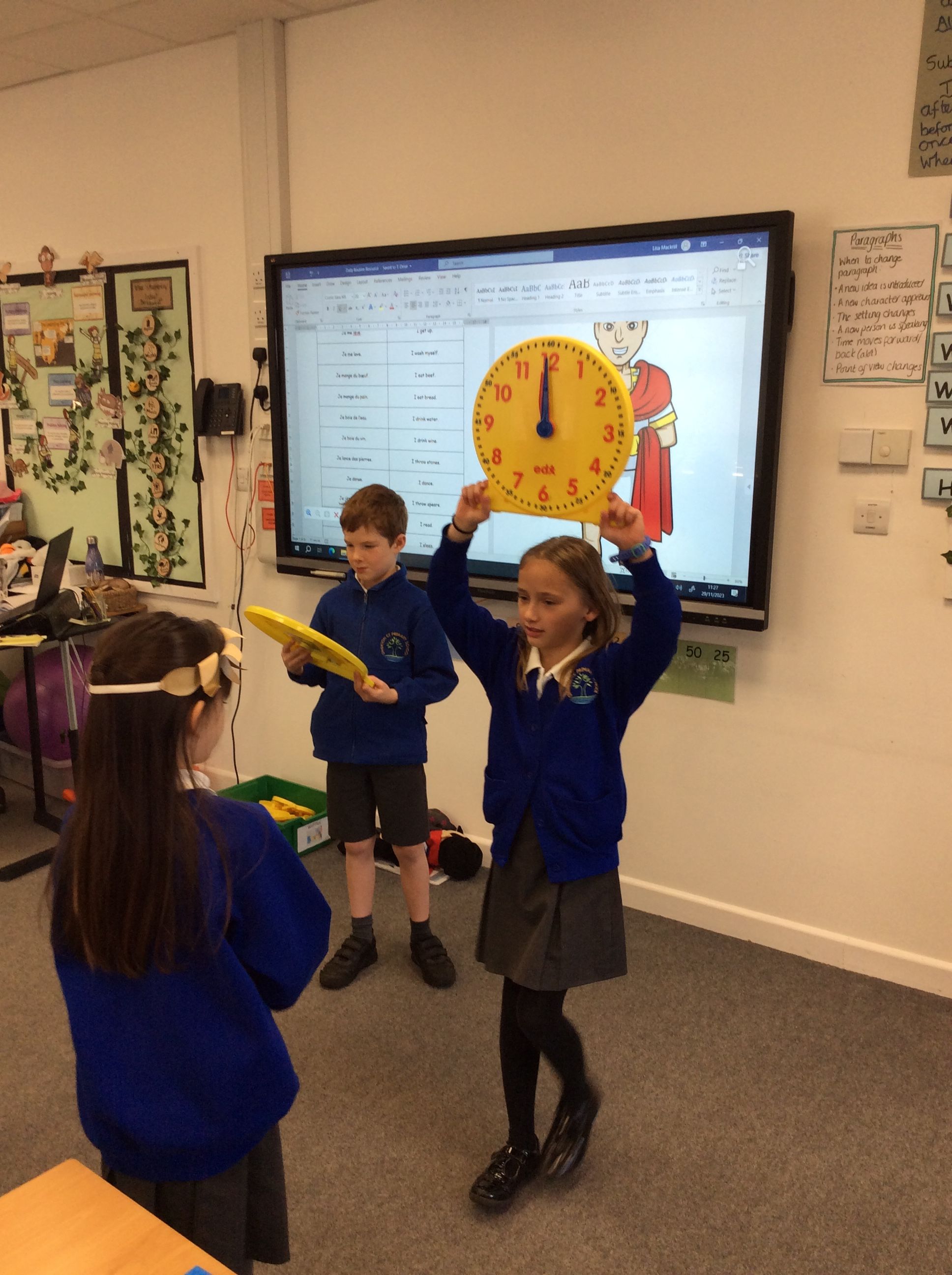 We have been busy in French learning how to tell the time to the hour. We learnt some daily routine phrases and adapted them to cross the curriculum divide into their topic work on ‘Romans’. We spent some time imagining the daily life of a Roman soldier and the emperor and how different they would be. This culminated in a group dialogue which was then performed in front of the class. Lots of fun!