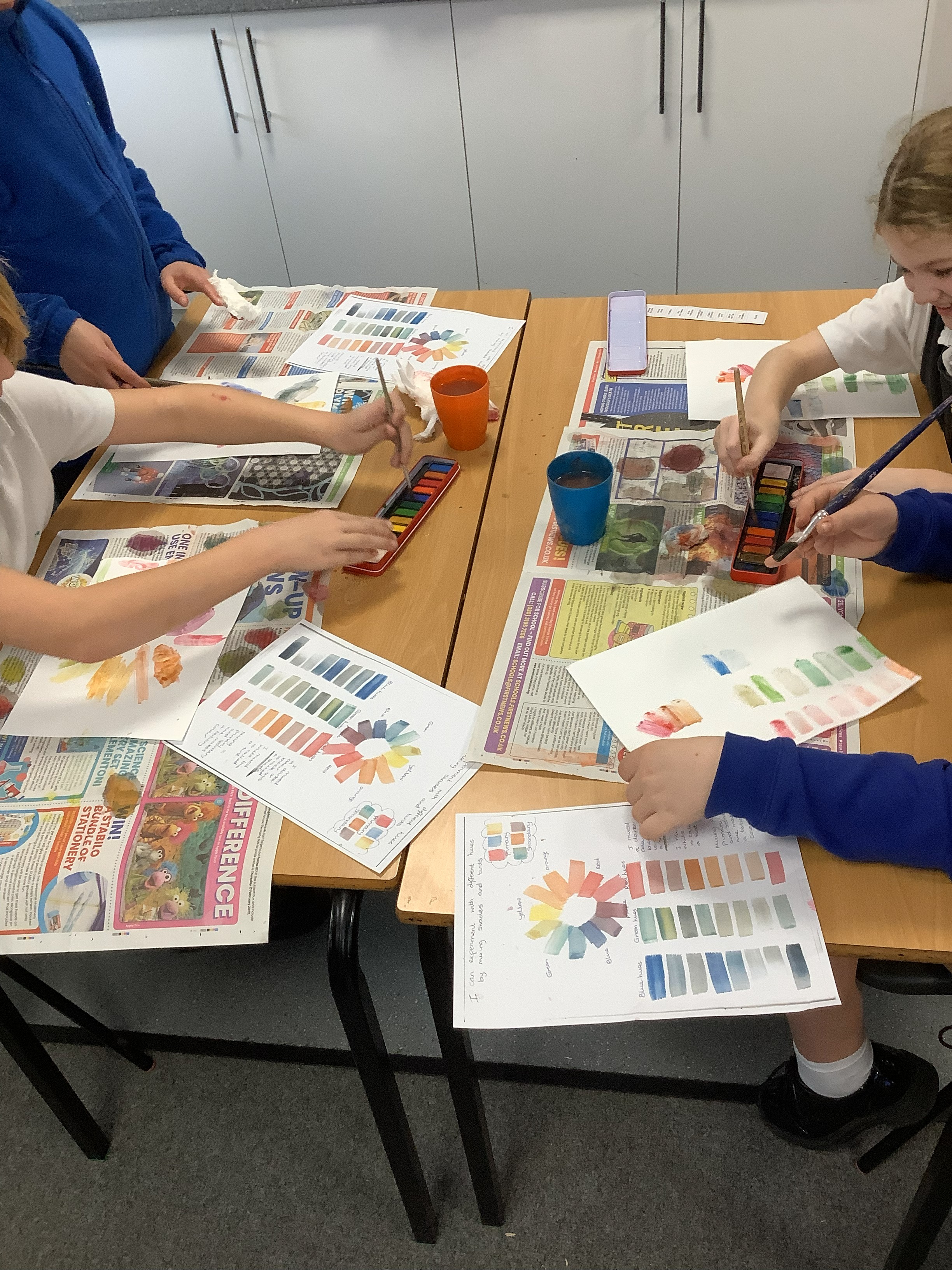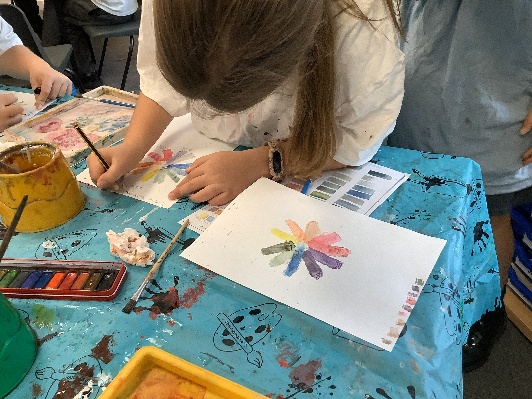 We have been experimenting with watercolours and spent time practising our colour wheels – mixing primary colours with black (creating shades) and white (creating tints).